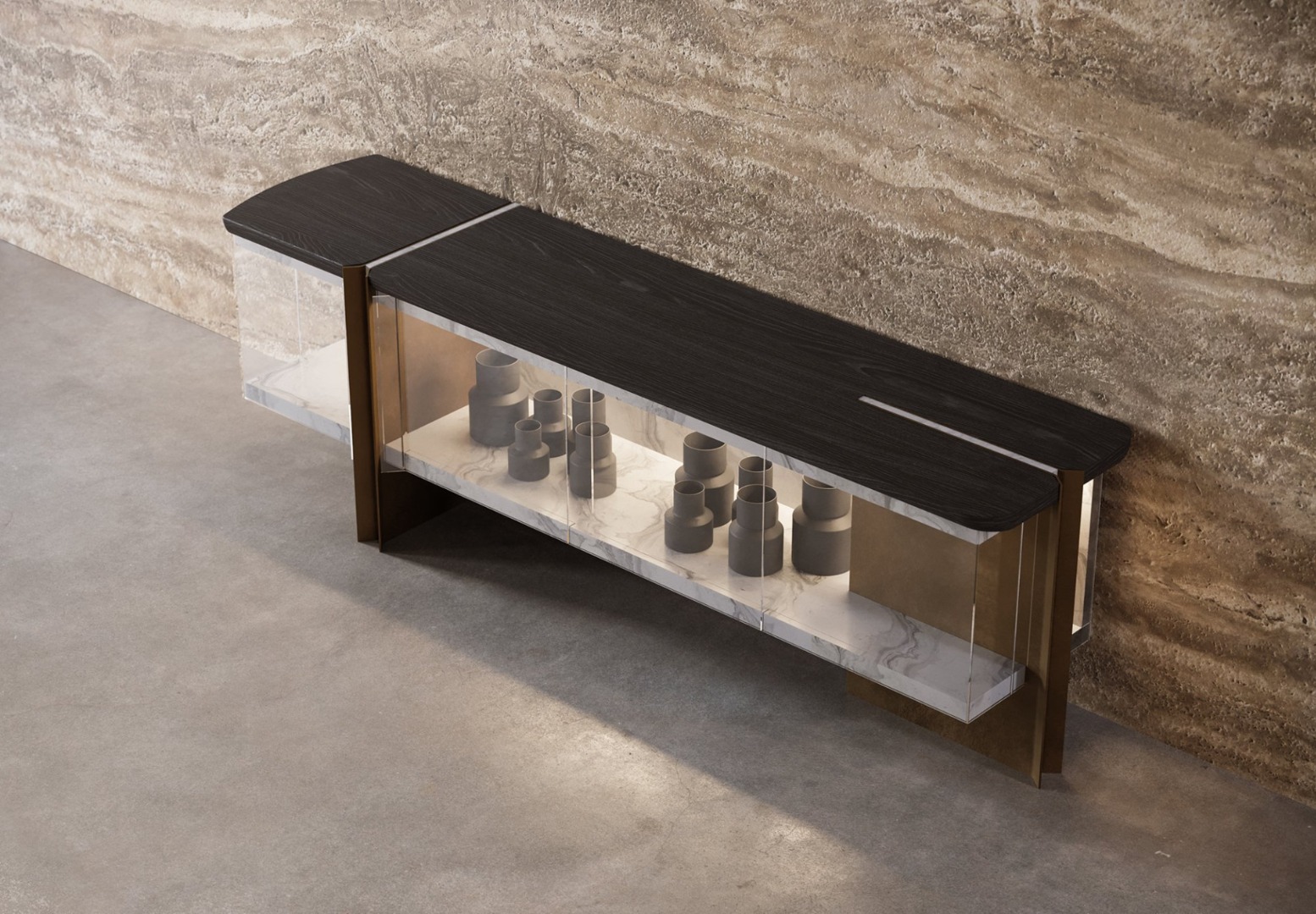 Saydam, havada asılı gibi duran cam gövdesiyle güncel dekorasyon trendlerini takip eden Foil Konsol, tek gövdede çift işlevli bir ünite: konsol ve vitrin. Tasarıma hükmeden sesi kısılmış maksimalist yaklaşım ürünü gerçek bir başyapıt olarak mekânın odağına yerleştiriyor. İnceltilmiş mermer fonu ve kumlanmış masif ahşap üst tablası ile cam gövde, kışkırtıcı endüstriyel unsurlarla destekleniyor ve güçlendiriliyor. Mermer şeritlerle zarif bir şekilde bağlanmış kırlangıç kuyruğu formundaki metal ayaklar, zenginleştirilmiş zarafet tanımına bir gönderme. Uzaktan kumandalı LED ışık havuzu ile donatılan cam gövdenin dışa eğimli kapıları, metal kırlangıç kuyruğu taşıyıcının eğimine birebir uyumlu. Ürün, renkli cam seçenekleriyle daha cesur, daha ağır bir karaktere bürünüyor.