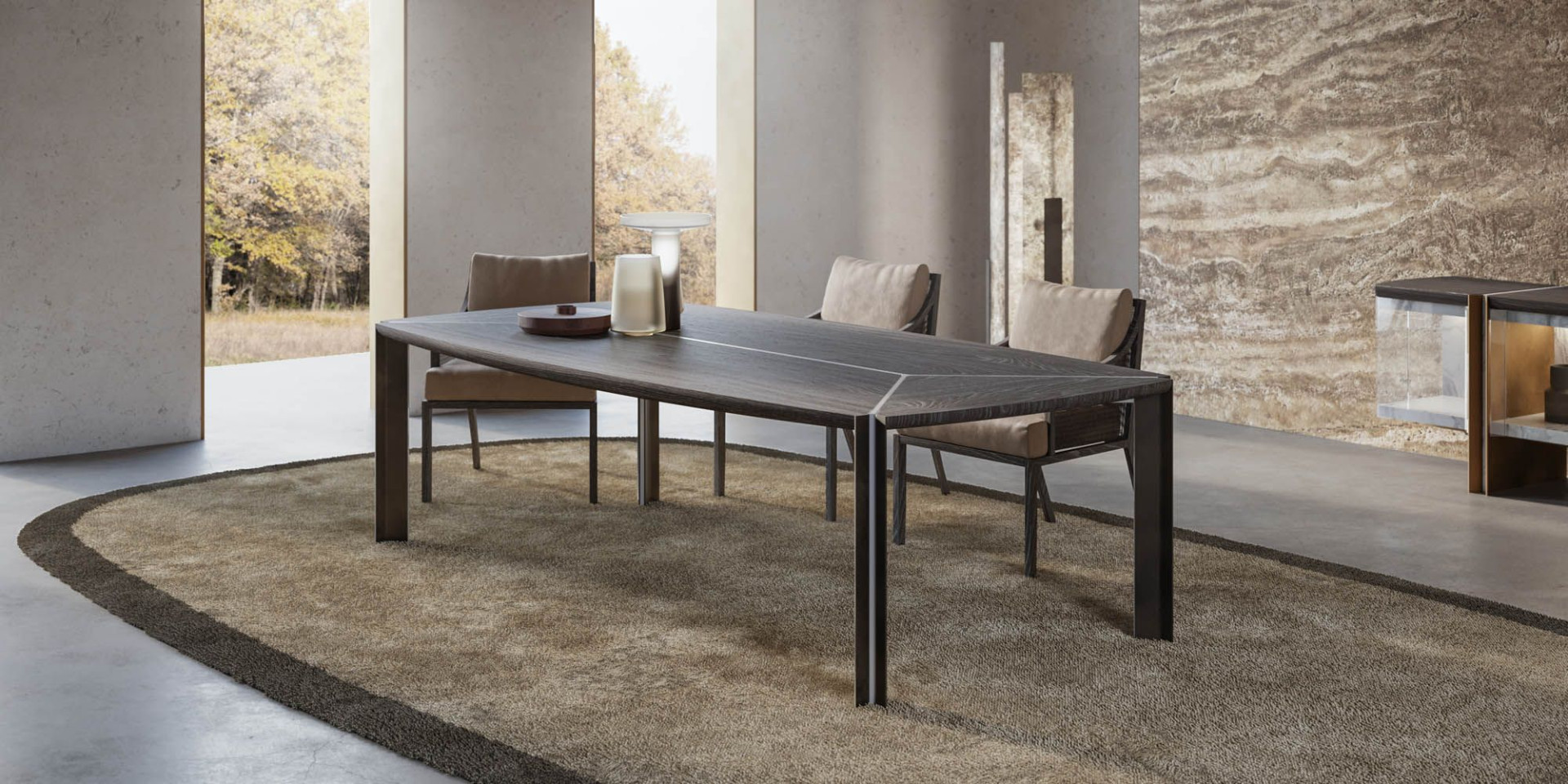 Minimalist ancak ayakları yere basan, lüks bir tasarım olan Foil Masa, Le Corbusier'in Ronchamp Şapeli'ne ince göndermeler barındıran zarif bir mobilya. Uzaktan 10 kişilik, dört ayaklı sıradan bir masa gibi görünen ürün, yakından bakıldığında, incelikli işçilikle bir araya getirilmiş üç farklı malzemenin; kumlanmış masif ahşap, mermer ve metalin kusursuz birlikteliğini ortaya koyuyor. Mermer şeritlerle vurgulanan kırlangıç kuyruğu formundaki metal ayaklar, ahşap tablanın altına gizlenmiş desteğe bağlanıp, masayı bir arada tutuyor. Ayaklardaki mermer şerit detayı tablanın ahşap parçaları arasındaki derzlere de yerleşiyor. Ürüne önden bakıldığında göze çarpan, ortasına hafif bombe verilmiş masa tablası, Ronchamp Şapeli'nin kıvrımlarından ilham alıyor. Tablanın kemerli uçları ise, benzer bir tasarım kararını gözler önüne seriyor.