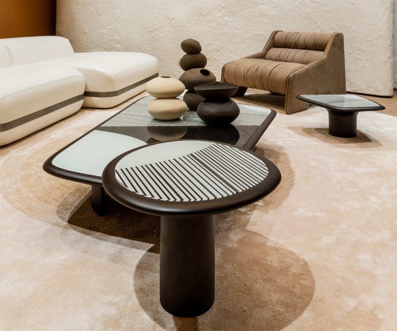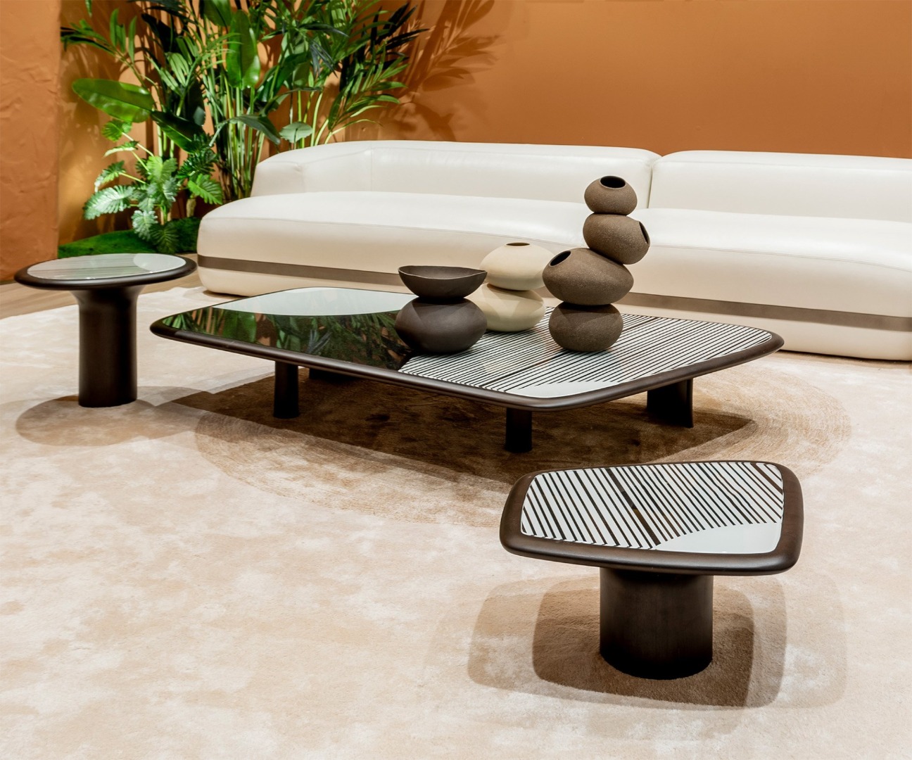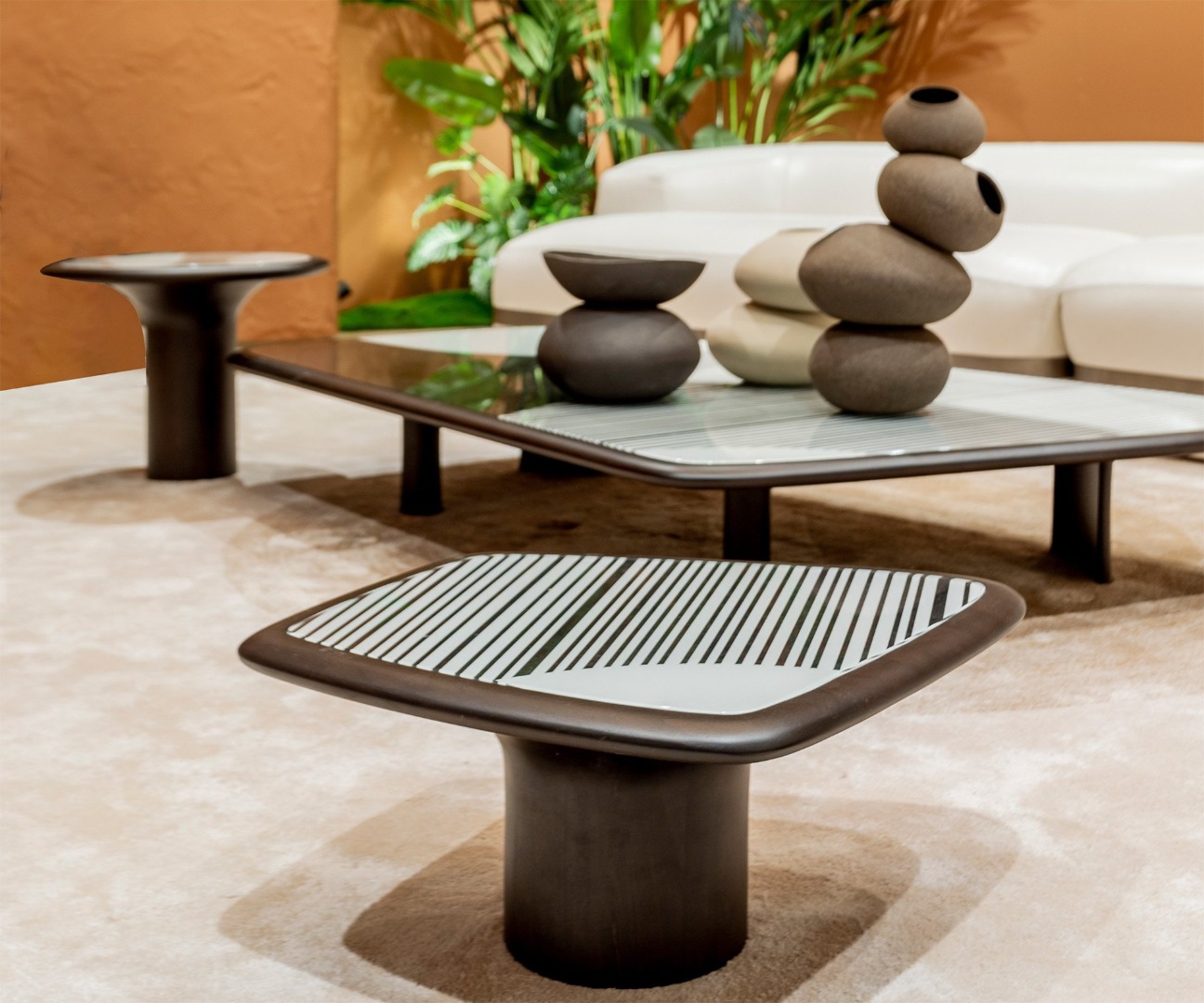 Kökleri yetmişi yılların bol desenli Afro-Bohem stiline uzanan ve günümüzün sıcak minimalizm tarzıyla özdeşleşen bir duruşa sahip olan Holly Sehpa, dört farklı form ve boyutta kullanıcıyla buluşuyor. Farklı cila alternatifleri bulunan masif ceviz gövde üzerine yerleşen siyah-beyaz baskılı cam, tasarımın odak noktasını oluşturuyor. Tasarımcı tarafından belirlenmiş dört alternatif desenden birini seçmek mümkün. Yan sehpalar, soyutlanmış mantar, orta sehpalar ise amorf dikdörtgenler olarak hayat buluyor. Holly Sehpalar, iç mekânda sakin odak noktaları yaratmak amacıyla tek tek ya da ortada gruplanarak kullanılabilir. Ev, ofis, otel ve her türlü bekleme alanı için mükemmel seçim.