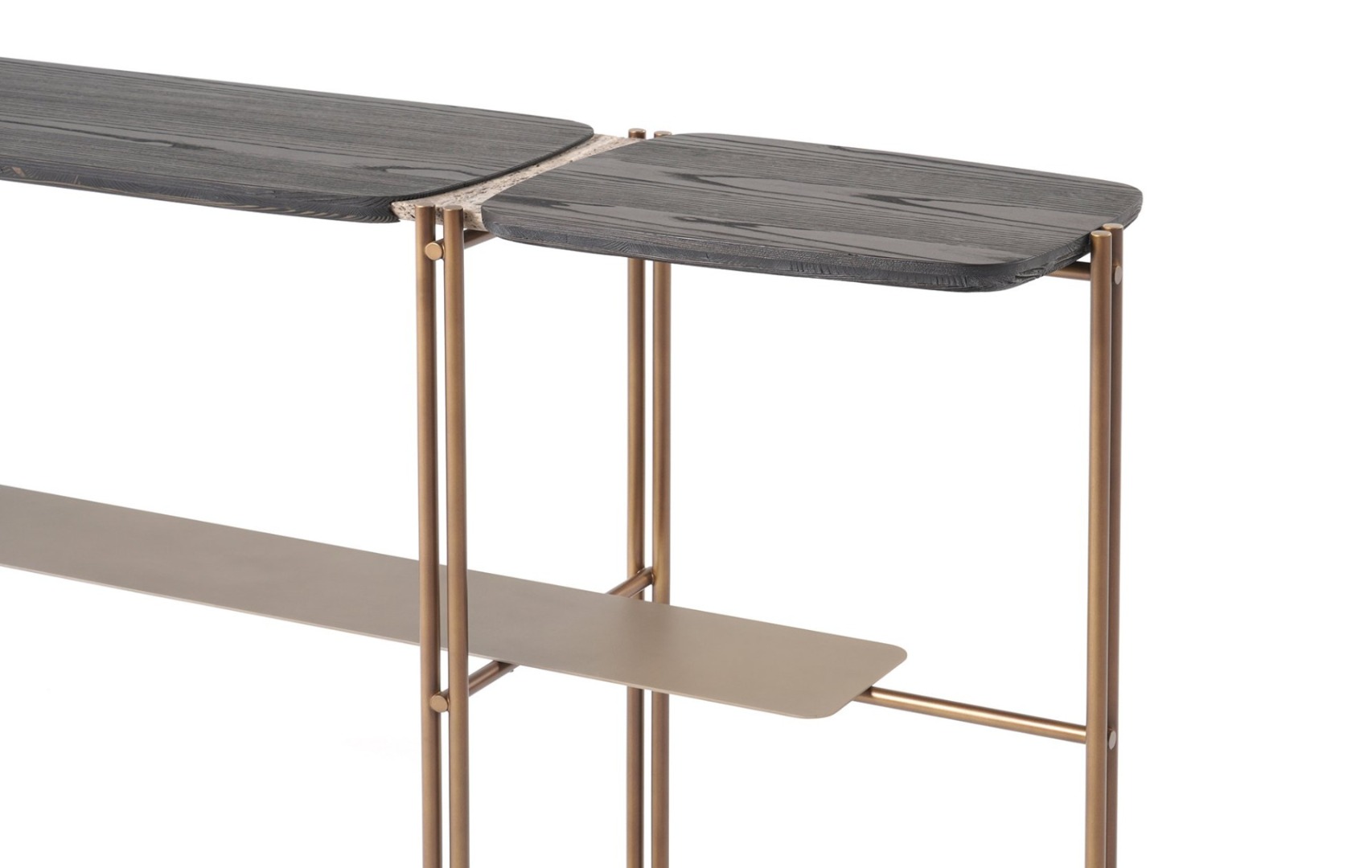 Maurizio Manzoni tarafından tasarlanan Hub Dresser, minimalizm ve işlevselliğin uyumlu bir birleşimidir. Modern iç mekanlara uyum sağlamak için titizlikle tasarlanan bu parça, saten pirinç kaplamalı zarif bir metal çerçeveye sahiptir ve hafif ancak sağlam bir yapı sunar. Çift katmanlı dokulu yüzeyleri, zarif bir estetiği yansıtırken geniş depolama veya sergileme alanı sağlar. Alanınızı yükseltmek için mükemmel bir seçenek olan Hub Dresser, sofistike zanaatkarlığın ve çok yönlü tasarımın bir göstergesidir.