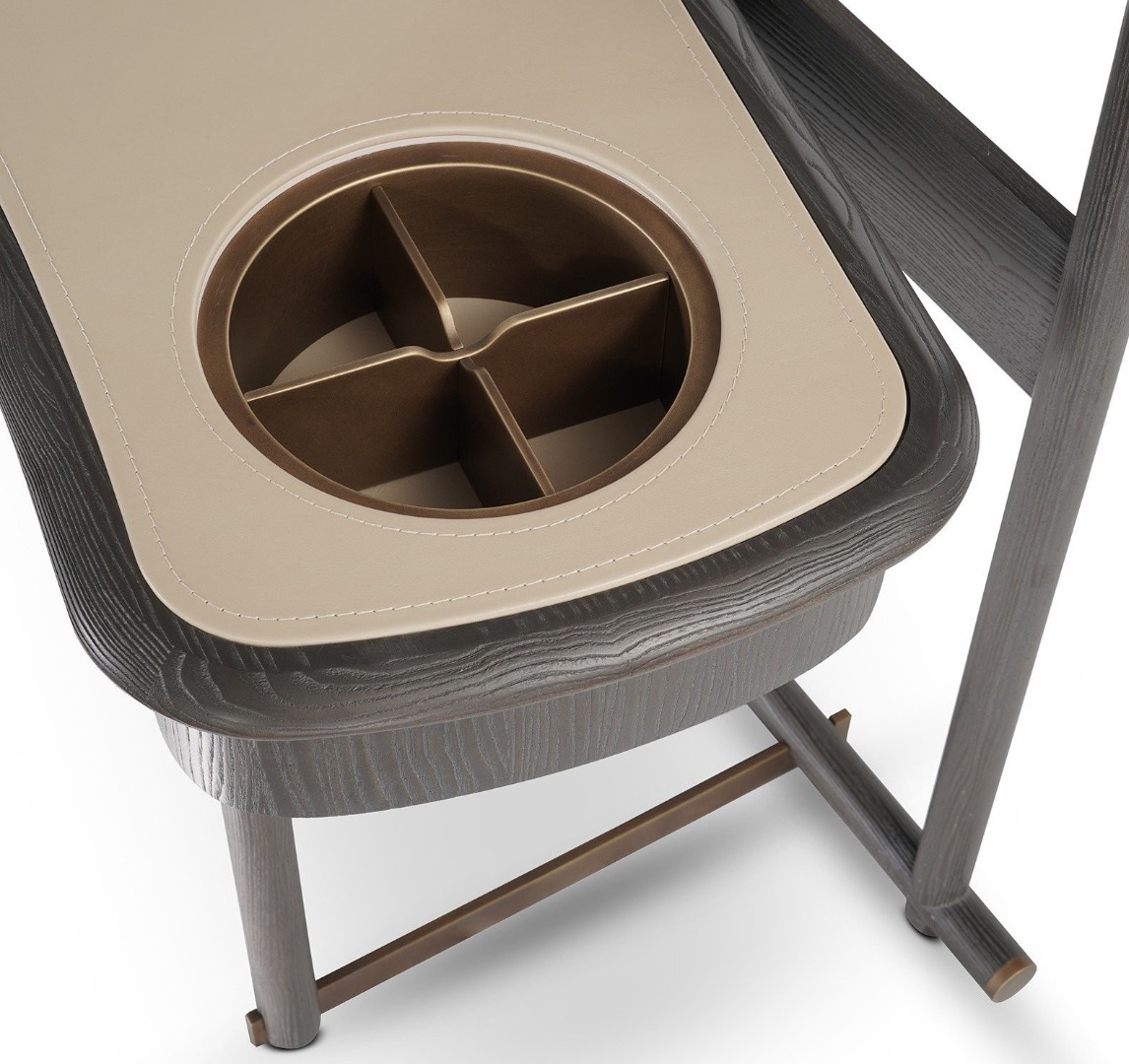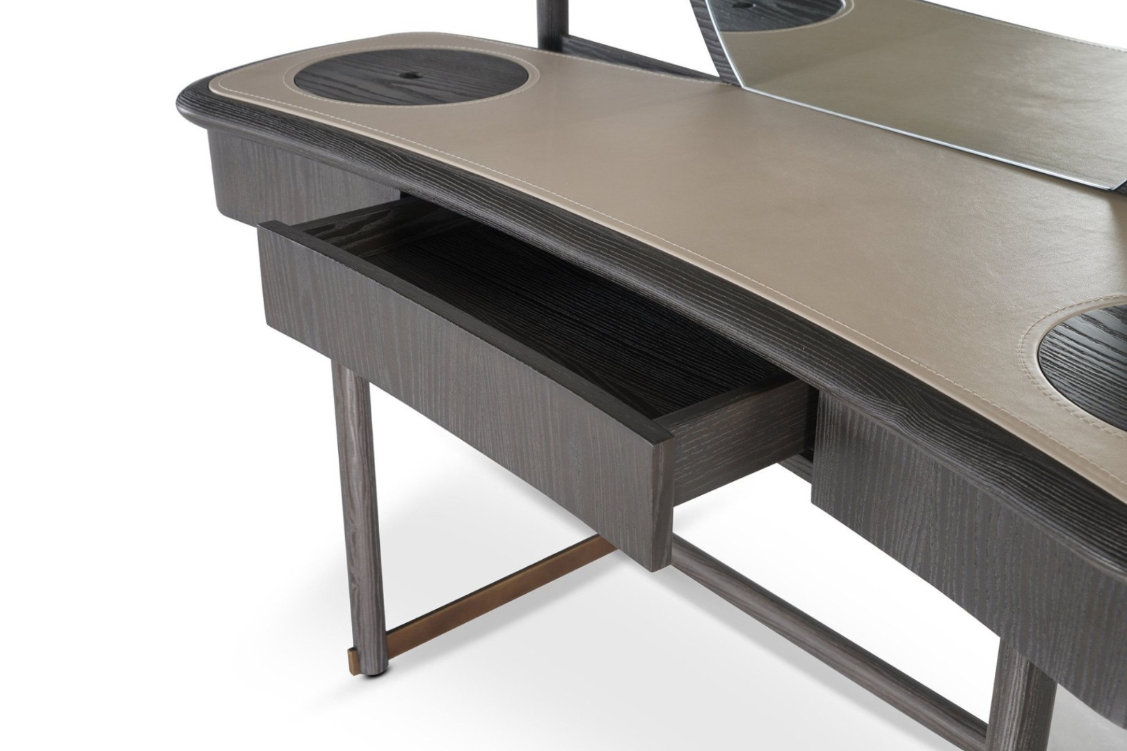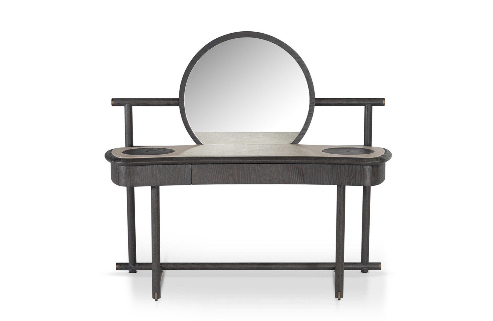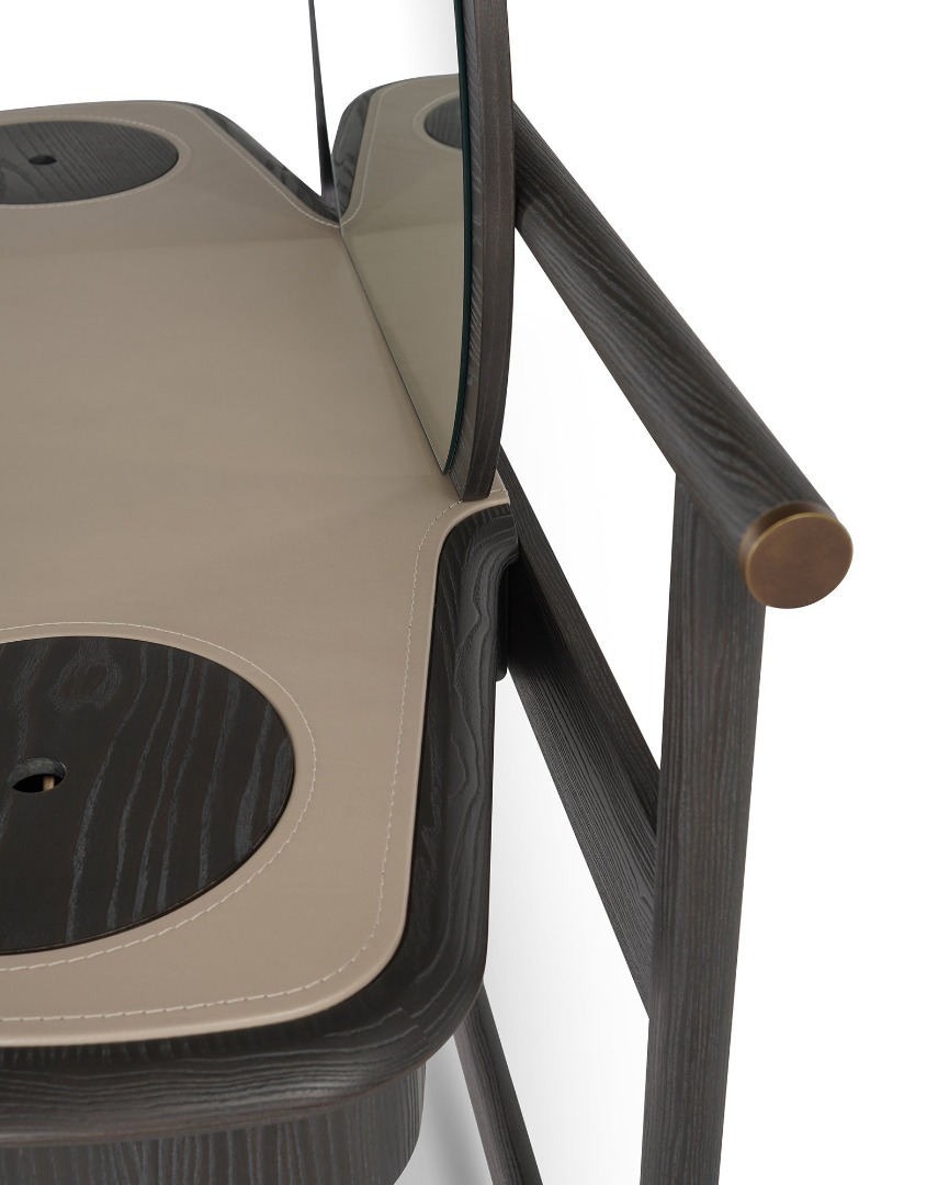Sökülebilir bir ayna, ön çekmece ve masaya gömülü, ahşap kapaklı iki yuvarlak cep ile donatılmış Kimono Dresuar, sıra dışı geometrik kütleleri ve ahşapla metali bir araya getiren etkileyici birleşim detaylarıyla öne çıkan bir mobilya. Fasulye formundaki çekmeceli masası, aynı seriye ait yatağın başlığına benzeyen ahşap bir çerçeveyi kavrıyor ve üzerine oturuyor. Masanın üst tablası deri veya nubuk döşenebiliyor. Metalik boyalı masif ahşap gömme cepler, içlerine yerleştirilmiş esnek ayırıcılar sayesinde takı ve küçük makyaj malzemelerini birbirine karıştırmadan depolamaya yarıyor. Döşeme, ahşap ve metal kısımlar farklı renk/doku seçeneklerine sahip.