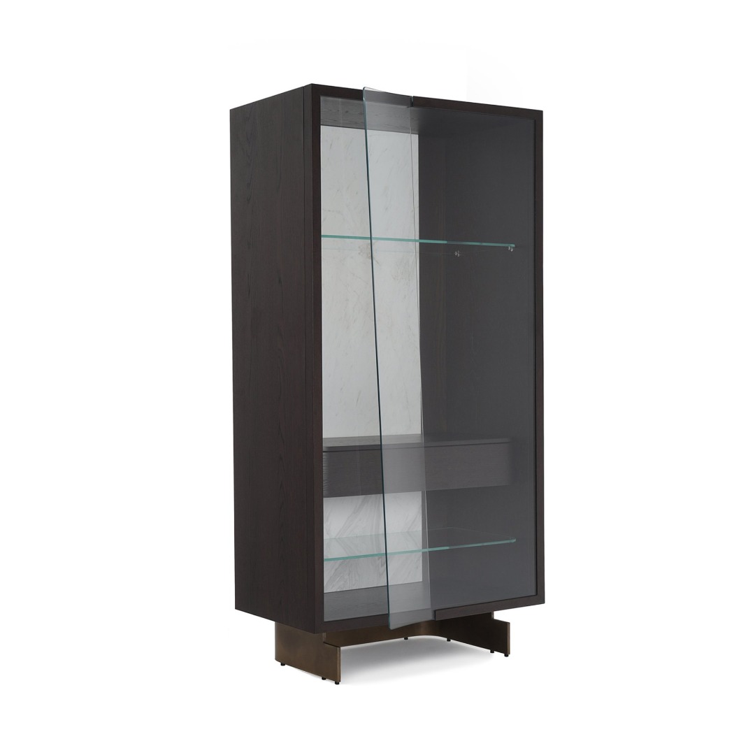 Üç asırlık cam sanatı geleneğiyle nam salmış İstanbul'un prestijli cam ustaları tarafından üretilen şeffaf cam kapaklarının şaşırtıcı, imkânsız kıvrımlarıyla öne çıkan Leaf Vitrin, koleksiyonun diğer parçalarıyla aynı özgün dili konuşan bir yapıya sahip. Ahşap kaplama kabinin içine yerleşen cam raflar ve ahşap çekmece ünitesi, iki farklı kombinasyonda üretiliyor ve kullanıcıyla buluşuyor. Kişisel hazinelerin tüm görkemini sergilemek için yaratılmış kasanın içindeki mermer fon, gizli LED ışık havuzu ile vurgulanırken ürünün her türlü mobilya kombinasyonu için göz kamaştırıcı bir zemin oluşturması sağlanıyor. İncecik metal ayaklar ise, ürünü yükseltip tasarımın kütlesel bütünlüğünü pekiştiren önemli bir unsur.