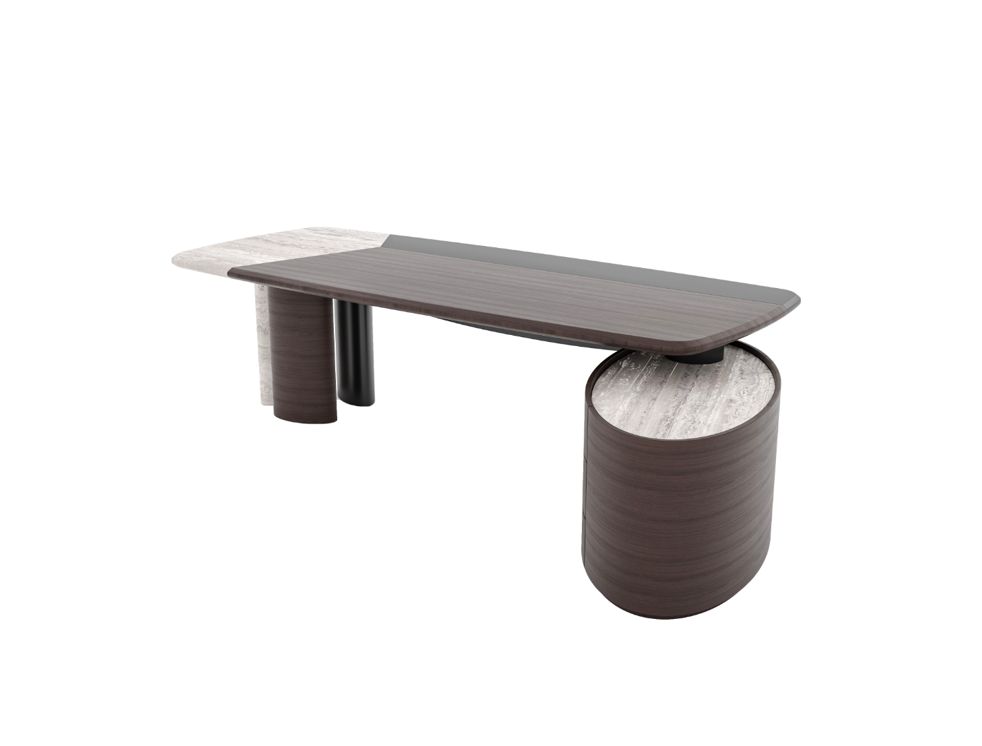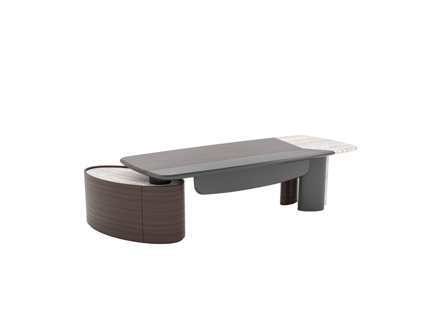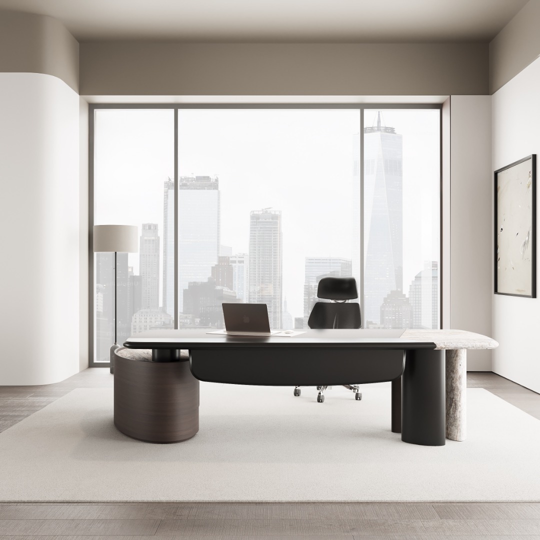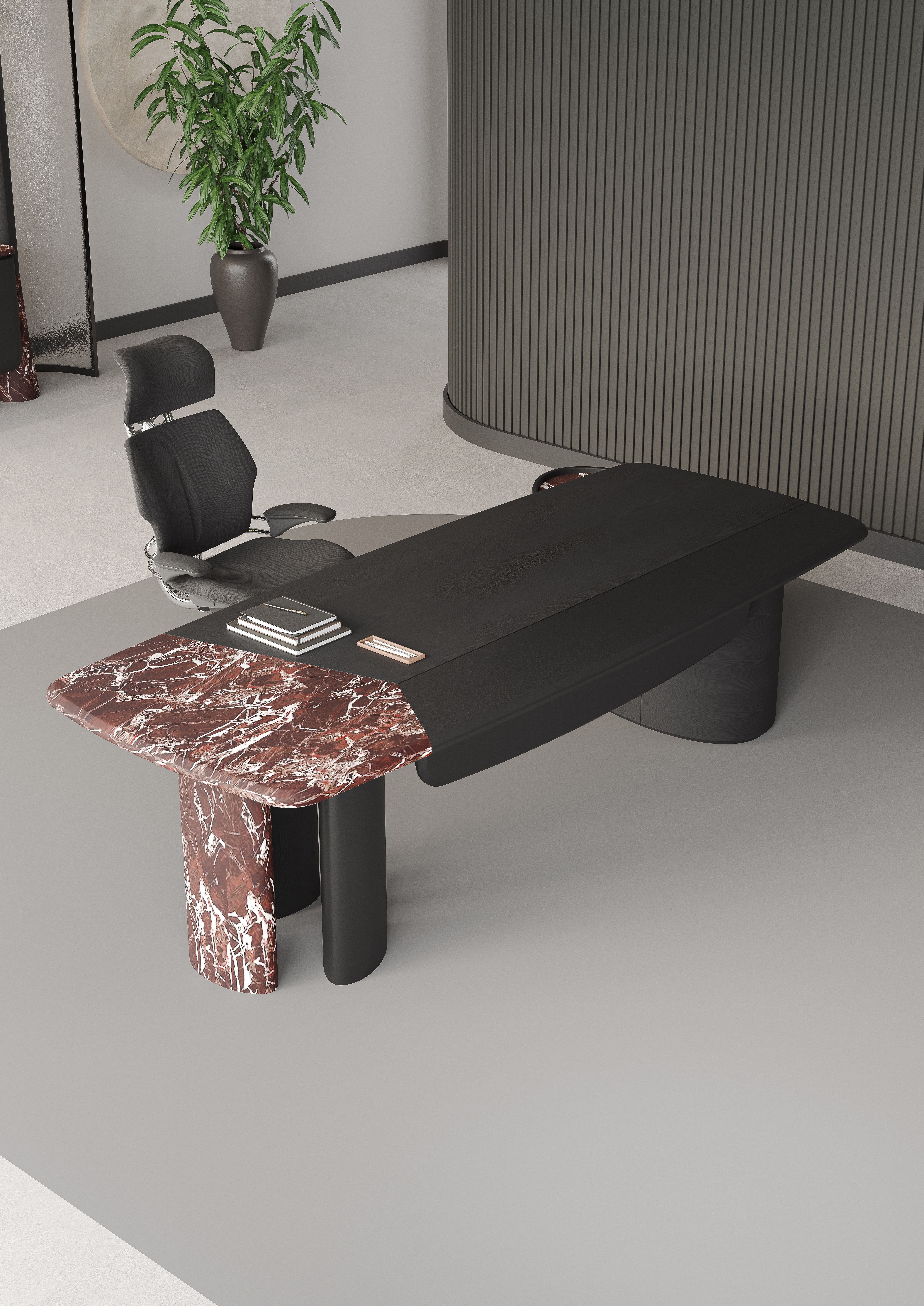Kütlesel dengesi ve oval çizgileriyle mekânda sakin ama güçlü bir varlık oluşturur. Lorca, yalnızca bir çalışma alanı değil; yöneticinin mekânla kurduğu ilişkinin mimari bir parçasıdır.