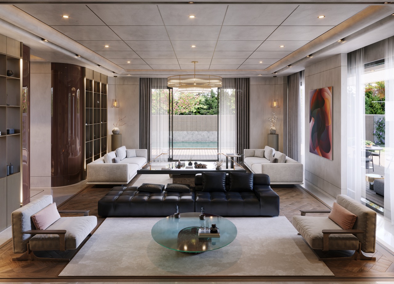 Salon ve ortak yaşam alanlarında kullanılan mobilyalar; mekânın akışını kesmeyen, hacmi destekleyen ve mimari bütünlüğü güçlendiren formlarla tasarlanmıştır. TV üniteleri, konsollar, kitaplık sistemleri ve özel depolama çözümleri; duvar yüzeyleriyle bütünleşerek sade ama güçlü bir mekânsal ifade oluşturur.