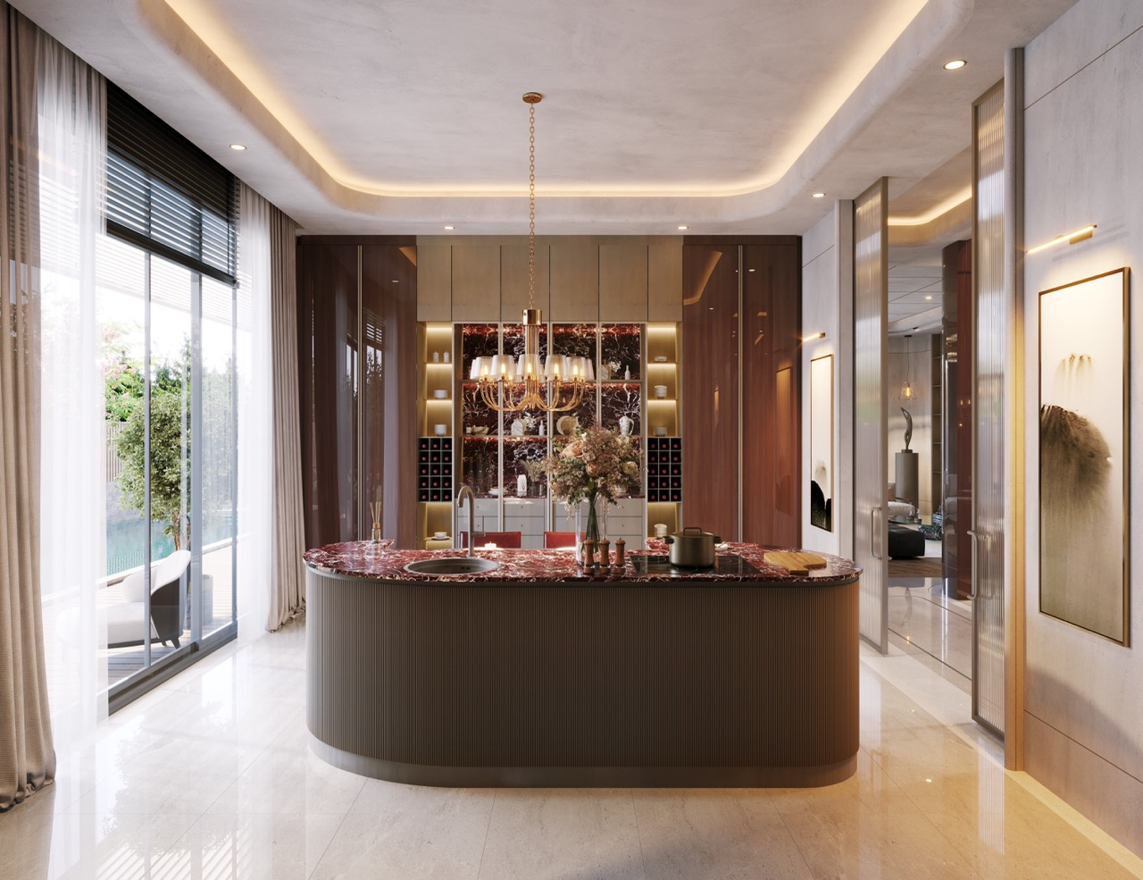 Nexus Regnum mutfakları; yüksek tavanlı hacimlere özel tasarlanmış, çift ada düzeni, geniş depolama çözümleri ve doğal taş–doğal kaplama birlikteliğiyle öne çıkar. Mermer yüzeyler, doğal ahşap kaplamalar ve mat yüzeyler; hem estetik hem de uzun ömürlü kullanım kriterleri gözetilerek seçilmiştir.
