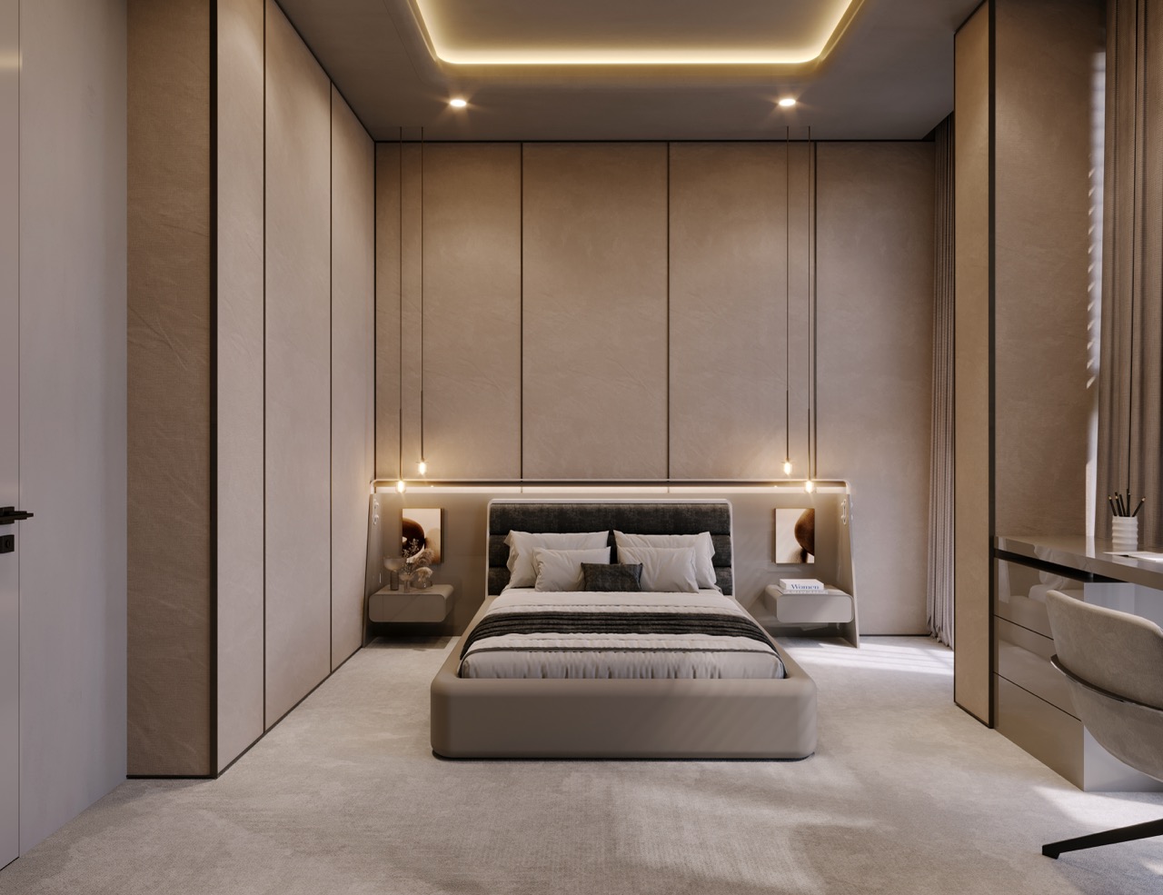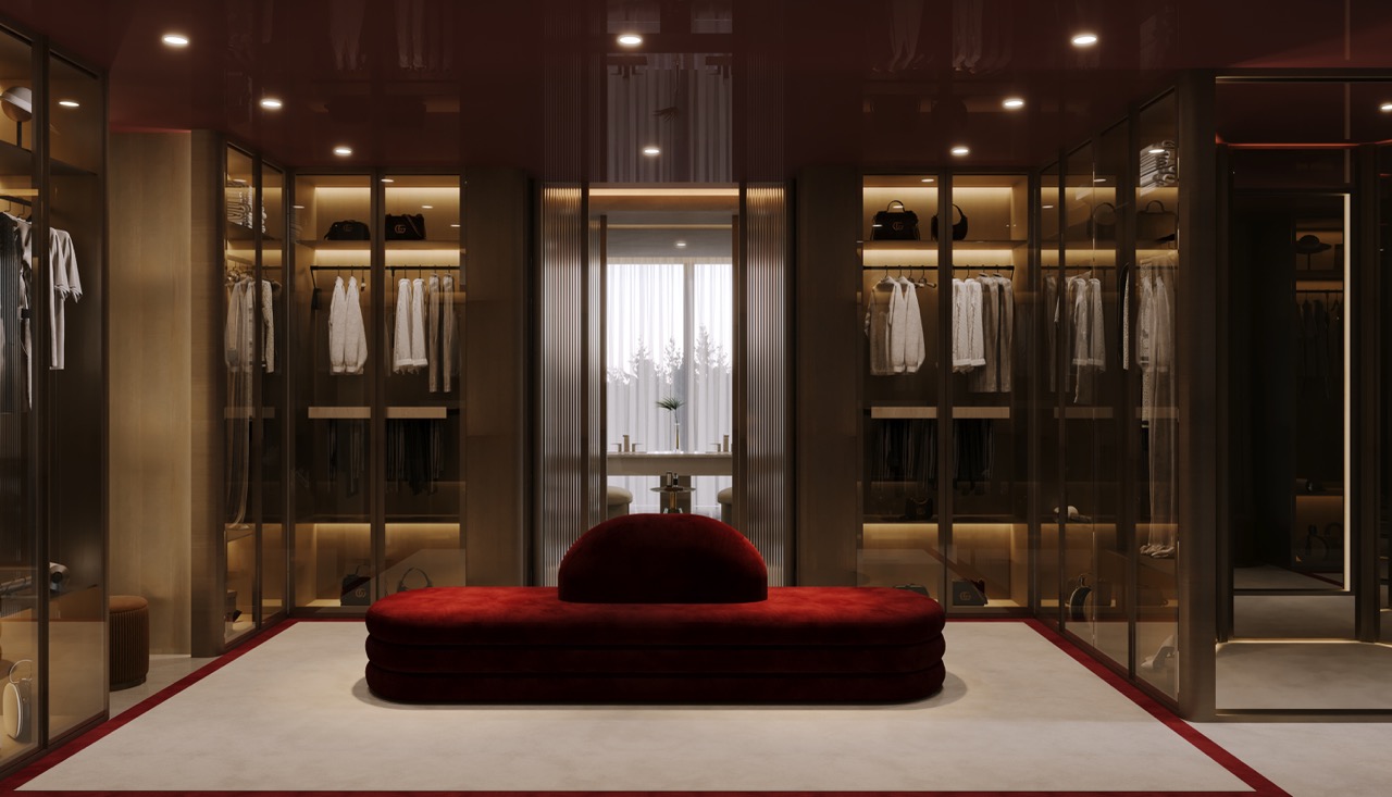 Yatak odaları ve giyinme alanlarında ise; fonksiyonel planlama ile zarif detaylar bir araya getirilmiş, kullanıcı alışkanlıklarına göre özelleştirilebilen dolap sistemleri geliştirilmiştir.