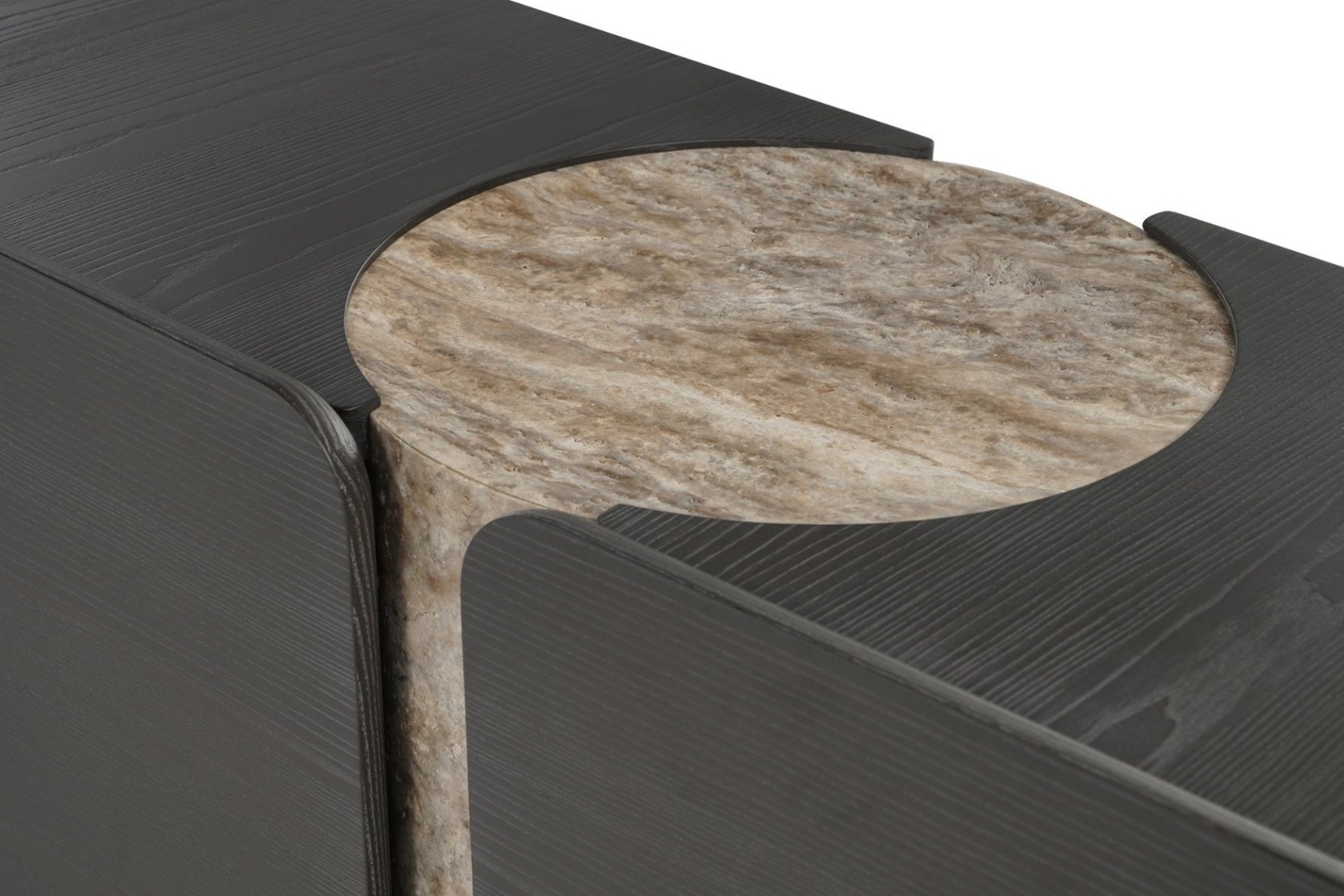 Koleksiyonun belirgin asimetrik ve yuvarlatılmış çizgilerini takip eden Titano Konsol'un gövdesi, içi boşaltılıp hafifletilmiş taş sütunun etrafına tutunan iki farklı boyut ve formda kübik kütlenin birleşmesinden oluşuyor. Dolap kapakları arasında yaratılan boşluk, kasanın tavanına kadar uzanan sütun ayağın somut, taş dokusunu ortaya koyuyor. Çekmeceli uzun kanadı destekleyen ve uca doğru açılıp kırlangıç kuyruğu formuna kavuşan incecik metal ayağın parlak, keskin ve pürüzsüz görüntüsü ahşap dolabın yuvarlatılmış köşeleri ve mat, kumlanmış, pütürlü yüzeyiyle bir zıtlık dengesi yaratıyor. Tüm malzemeler yerel üreticilerden temin ediliyor. Taş sütun ayak, traverten ve mermer seçeneklerine, masif ahşap kapaklar, ahşap kaplama gövde ve metal yüzeyler çok sayıda renk alternatifine sahip.