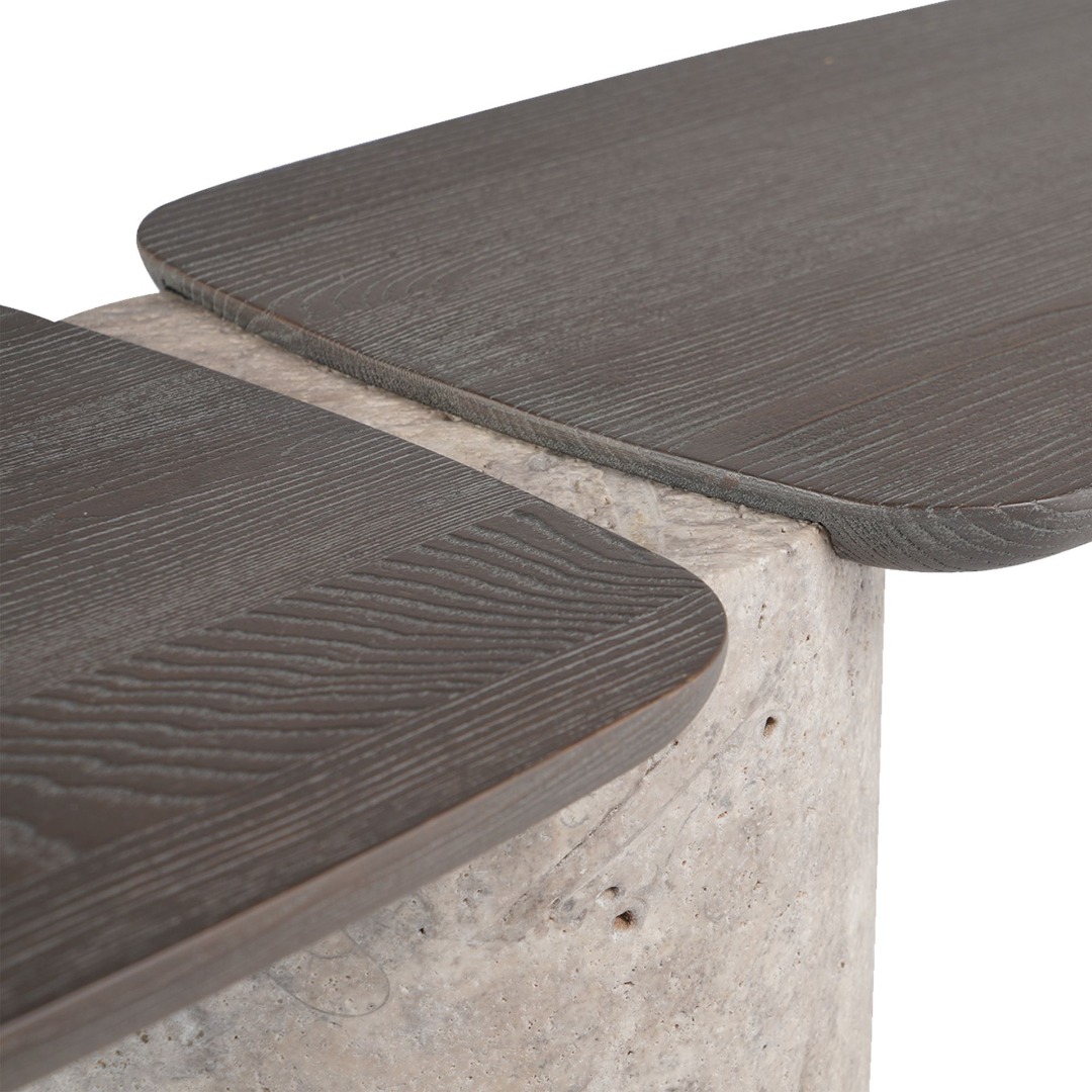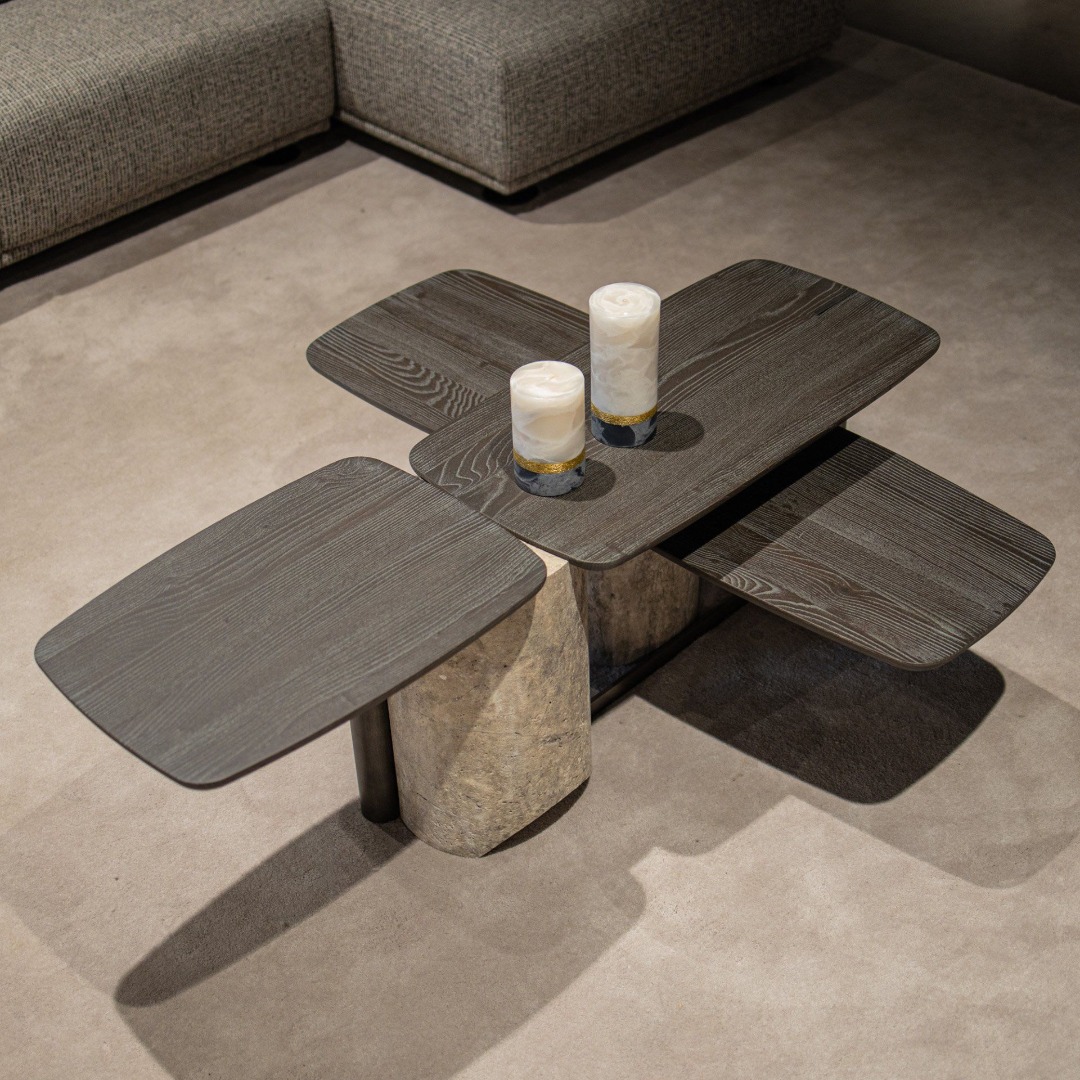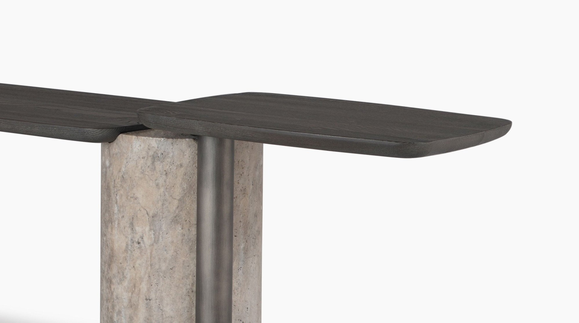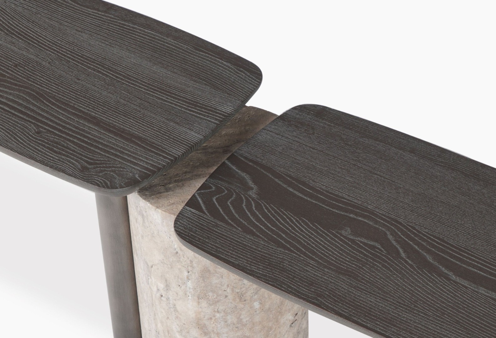 İç mekânda tek başına odak noktası yaratabilecek güçteki tasarım diliyle dikkat çeken Titano Sehpa, farklı gereksinimlere ve tercihlere uyum gösterecek iki alternatif form ve boyutta üretiliyor. Titano Sehpa A, kanatları açılmış, uçmaya hazırlanan bir kuşun kavramsal bir yorumu niteliğinde, hafiflik duygusu veren bir ürün. Kenarları yuvarlatılmış masif ahşap tablalar, doğal taş sütunun tepesindeki oyuklara tutunarak, ürünün asimetrik, heykelsi özünü ortaya koyuyor. Titano Sehpa B, masif ahşap tablaları desteklemek için tamamlayıcı metal ayaklarla donatılmış, zemine basan bir tasarım. İnce metal şerit ayak, uzun ahşap tablayı alttan desteklerken taş sütunla birleşen metal bir boru, diğer tablayı bir kademe yükseğe taşıyarak iki yüzey arasında kot farkı yaratılmasına imkân tanıyor. Tüm malzemeler yerel üreticilerden temin ediliyor. Taş sütun ayak, traverten ve mermer seçeneklerine, kumlanmış masif ahşap tablalar ve metal yüzeyler çok sayıda renk alternatifine sahip.